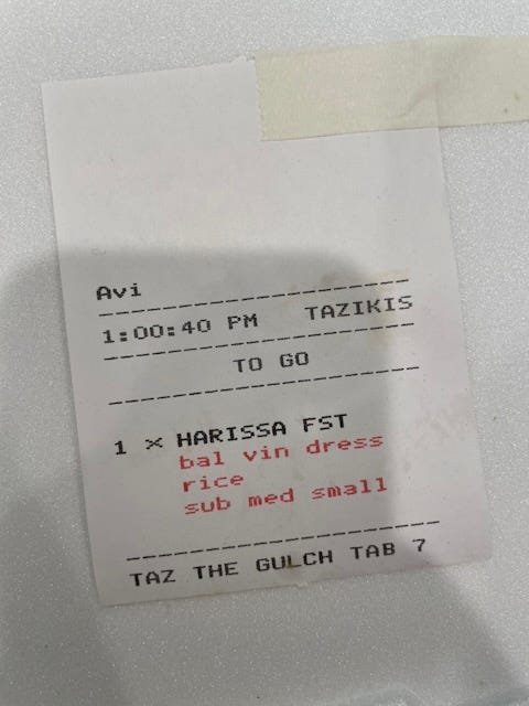 As for my salad, it was Mediterranean in the same way that a postcard from the gift shop under the nearby replica of the Parthenon is Greek architecture — adjacent, perhaps, but hardly a substitute for the real thing. The roasted red peppers and the cursory sprinkle of feta cheese could no more transport me to the Aegean than the meal’s clamshell container could double as a trireme. Yet, as Socrates said — “hunger is the best relish,” and so I soldiered on, navigating the mildly treacherous waters of this “Mediterranean” mirage, my taste buds yearning for the shores of authenticity, even as we set sail on the SS Taziki’s, bound for parts unknown.